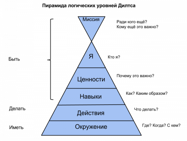 И в коучинге, по поводу смысла, есть еще один инструмент, тоже пришедший из НЛП– пирамида Дилтса. Есть такое утверждение, что проблема не решается на том же уровне, на котором она возникла, надо как бы подняться над проблемой… но куда, как? В пирамиде Дилтса предлагается пройти от проблемы (ситуации) с первого уровня – к действиям, что вы совершили, что привело к проблеме? Потом на третьем уровне надо спросить – почему вы так сделали, какую роль вы играли, какие правила или установки обуславливали ваше поведение? И в конечном счете опять приходим к вопросу – зачем это всё?