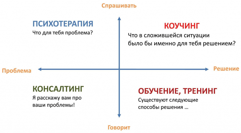 Деятельность коуча – это искусство задавать вопросы, отвечая на которые, человек приходит к осознанию своих проблем или возможностей. И здесь коуч не лечит (как психолог), и не учит (как консультант или ментор), он не приходит с готовым рецептом, и не говорит – я знаю что делать (аз есмь истина). Но он говорит, что знает – на какие вопросы вам надо ответить, и что он уверен, что вы сами сможете разобраться во всех своих проблемах, если озадачитесь ими по-настоящему.